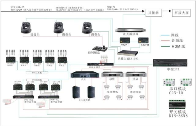 傳統(tǒng)音頻布線方式是每支麥克風都拉一條音頻線到機房,這樣不但施工復雜、管理不便、影響美觀,而且會使信號衰減,令原本清晰亮麗的人聲失真;針對此問題,軍區(qū)選用了名舞臺科技德捷品牌的DANTE網(wǎng)絡音頻轉換盒(DT-400 ),每四路音頻線進入網(wǎng)絡音頻轉換盒,轉換盒將前端CLOCKAUDIO的信號轉換成DANTE信號,無壓縮,無損耗地進入思美處理器,解決以上問題的同時,還可以實現(xiàn)IP網(wǎng)絡化管理;信號經(jīng)由思美處理器處理后,通過百靈達音箱將高清音質傳送給與會人員。音頻部分實現(xiàn)了信號無壓縮,無損耗,無延時,高保真,強保密,智能控制,分配管理。