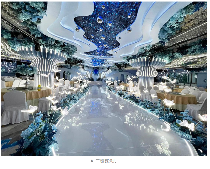 藝術宴會中心三樓宴會禮堂面積900㎡,層高6m且寬闊無柱式建筑設計,可容納500人,奢華的施華洛世奇水晶裝飾,猶如綴著無數顆寶石般的星辰,向賓客訴說著一種莫忘初衷,美好永存的美妙寓意。