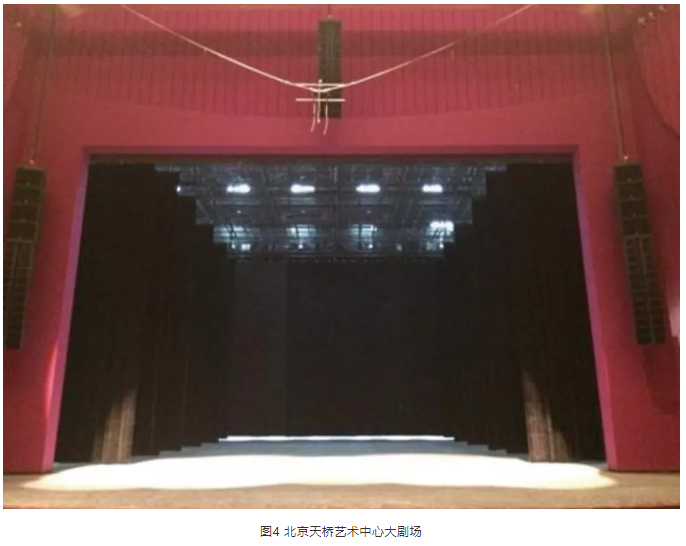 標準劇場中,中置揚聲器組的安裝通常分為暗裝和明裝兩種。暗裝一般是安裝在舞臺鏡框上沿預留的聲橋當中,如北京天橋劇場(圖3)。明裝則是吊掛在舞臺燈桿或預留的吊點上,如北京天橋藝術中心大劇場(圖4)。暗裝對觀眾的視覺影響最小,如果劇場擴聲系統設計合理,建筑聲學指標達標,且在鏡框高度不是很高的情況下,劇場中置聲道暗裝是最好的安裝方式。但是國內劇場的實際情況并不樂觀,且不同演出的系統工程師和音響設計師都有各自的設計和考量,暗裝中置聲道位置又基本不可調整,所以很多劇場中暗裝的中置聲道使用率很低。明裝的中置聲道更便于安裝、拆卸以及調整,更加適合流動性強的演出,因此,越來越多的現代化劇場采用這種安裝方式。