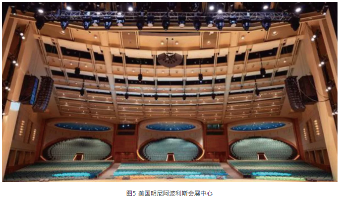 此外,還有一些劇場由于應用場景的不同,揚聲器系統既要減少舞臺垂直方向上對觀眾的視覺影響,還要滿足較寬觀眾席對水平覆蓋的需求。例如美國明尼阿波利斯會展中心使用ARCS恒定曲率線陣列揚聲器,這種揚聲器陣列在垂直方向上的輻射角度不可調整,但水平角度上中置揚聲器幾乎可以覆蓋到整個觀眾席,甚至可以比左右聲道揚聲器承擔更大的功率,這對于以語言類為主的會議等應用場景來說是十分方便且有效的。