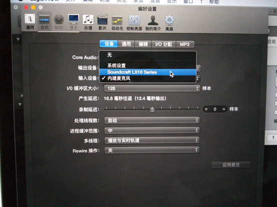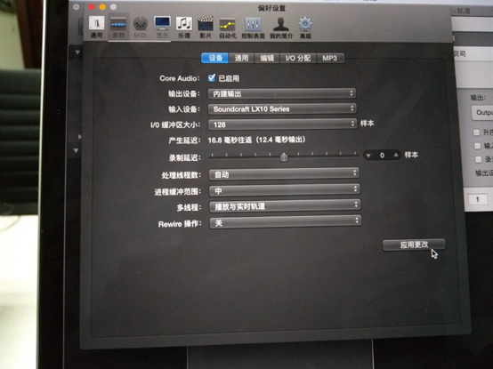 圖26:改好以后需點(diǎn)擊應(yīng)用更改,使更改生效。如果你要用此軟件進(jìn)行錄音回放,那么你的輸出設(shè)備也應(yīng)改為調(diào)音臺(tái)輸出。我這里沒(méi)用到就沒(méi)做更改。