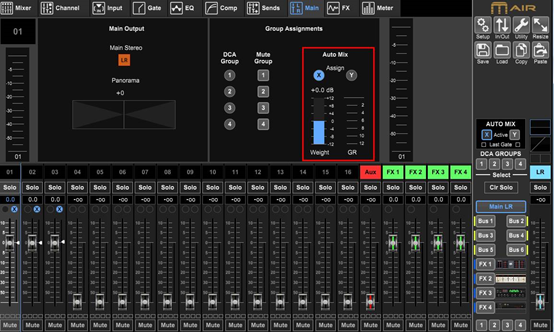 這里的AUTO MIX可分為兩組,分別為X和Y,還有一個(gè)AUTO Weight(自動(dòng)優(yōu)先級(jí)的量)可進(jìn)行調(diào)整,還有一個(gè)GR電平表可觀察到每個(gè)通道分享增益量的大小。