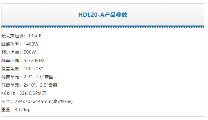 HDL20-A是一個(gè)可以快速簡(jiǎn)單設(shè)置的高性能的線性陣列。該音箱擁有1400W峰值的2路數(shù)字功放。聲音由DSP處理,它可根據(jù)陣列音箱的數(shù)量和室內(nèi)外環(huán)境來(lái)設(shè)置高頻的參數(shù)。 該系統(tǒng)采用了最先進(jìn)的RCF單元,兩個(gè)10”的單元用于低音再現(xiàn)和一個(gè)3.0”音圈的高音單元,用于提供高清晰度的聲音。