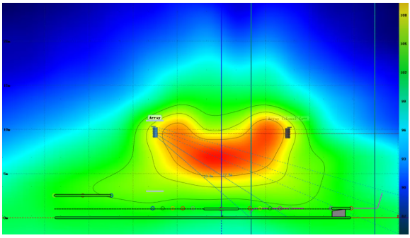 以下兩個系統仿真圖模擬了10顆雙10寸線陣列揚聲器在同一個劇場中對三層觀眾席最后一排的覆蓋情況(為了便于觀察,陣列被設置在了劇場的中軸線上)。第一張圖是陣列吊掛高度為15米,基本與第三層最后一排觀眾席持平,陣列物理姿態調整至如圖狀態后能夠在三層最后一排得到令人滿意的覆蓋。