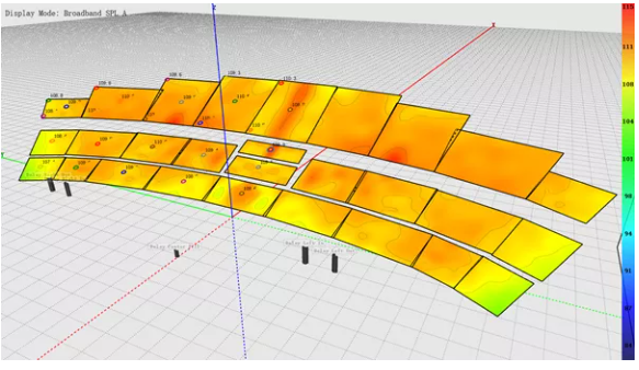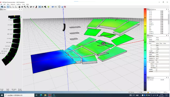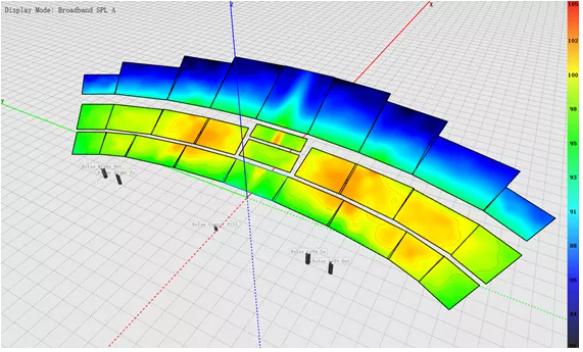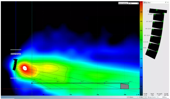 但在實際系統實施的過程中,吊掛高度很可能受限。因此第二張圖展示了同樣的陣列在吊掛高度為9米時的覆蓋情況,通過調整陣列物理姿態獲得了與第一張圖非常接近的覆蓋結果。