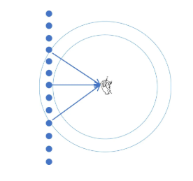 如圖,左邊一列圓點為換能器陣列,兩個圓以聽音者為圓心,它們的半徑差對應著被考察頻率的1/3波長,離聽音者最近的換能器到達時間最短,越靠陣列兩端,到達聽音者的時間越慢。當到達時間晚于1/3波長時,我們認為換能器在這個頻率上對聽音點沒有貢獻。