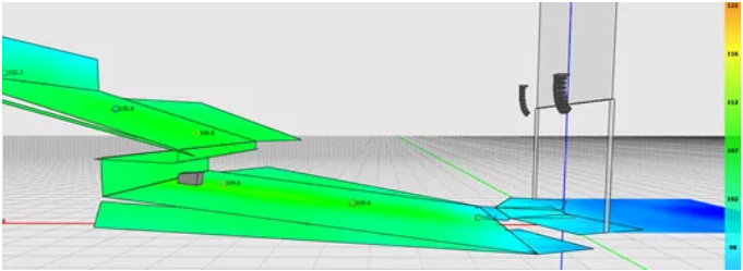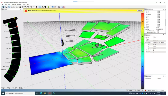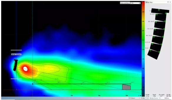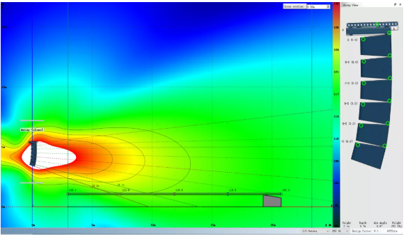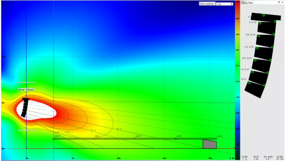 我們可以看到,為了獲得較為滿意的覆蓋結果,傳統線陣列在吊點高度不足時必須以接近極限的物理姿態來進行安裝。請注意最上面2顆音箱的快插銷已經出現了載荷警報,呈現紅色。在實際項目中如果遇到此類情況,就不得不在吊裝位置和覆蓋效果之間做出妥協。