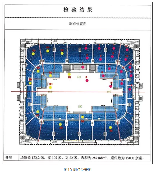 施工完畢后,進(jìn)行了現(xiàn)場(chǎng)實(shí)測(cè),測(cè)點(diǎn)如圖10所示。經(jīng)現(xiàn)場(chǎng)測(cè)試,擴(kuò)聲系統(tǒng)聲壓級(jí)可基本達(dá)到設(shè)計(jì)值,其他測(cè)量結(jié)果見圖11、表2—表4。測(cè)試結(jié)果反映,該項(xiàng)目達(dá)到設(shè)計(jì)目標(biāo)及行業(yè)相關(guān)標(biāo)準(zhǔn)指標(biāo)。