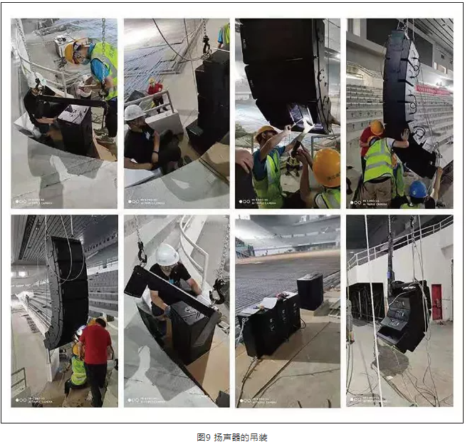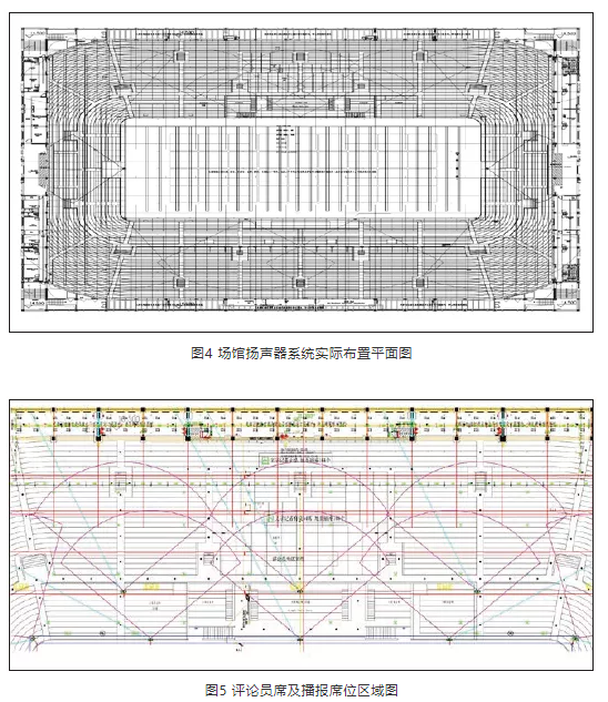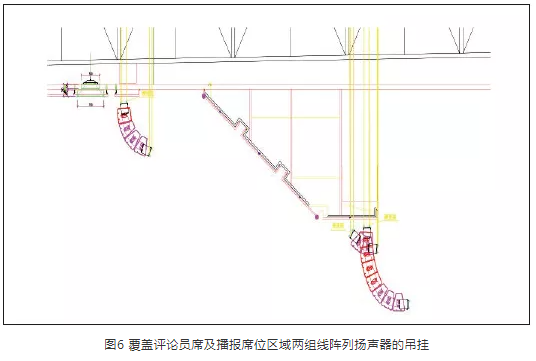 比賽場(chǎng)地上空設(shè)置有巨大的投影幕布,面積與比賽場(chǎng)地近乎一樣。為此,對(duì)場(chǎng)地?cái)U(kuò)聲系統(tǒng)提出了多種方案。其中,一種方案是調(diào)整揚(yáng)聲器的覆蓋角度,以避免因投影幕布反射形成的回聲,但受整體環(huán)境所限,難以實(shí)現(xiàn)。另一種方案是考慮采用透聲幕布,揚(yáng)聲器吊掛在透聲幕布上方,但會(huì)影響投影效果。在實(shí)施中,最初采用透聲幕布,經(jīng)過多方溝通,方案幾經(jīng)調(diào)整,在安裝位置與投影幕布之間取得平衡,最終采取分段式幕布加揚(yáng)聲器吊掛調(diào)整,將揚(yáng)聲器吊掛與各幕布之間,并選用8只小尺寸、高聲壓的點(diǎn)聲源揚(yáng)聲器P12,既不會(huì)影響投影效果,也可滿足聲場(chǎng)覆蓋,達(dá)到設(shè)計(jì)指標(biāo)。