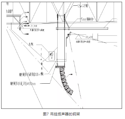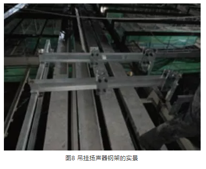 在揚(yáng)聲器系統(tǒng)吊掛過程中,由于首都體育館保留了原有大頂球型網(wǎng)架結(jié)構(gòu)、馬道,在球型網(wǎng)架的結(jié)構(gòu)下還有鋁板造型結(jié)構(gòu)以及龍骨,而揚(yáng)聲器系統(tǒng)的吊掛點(diǎn)位于大廳頂層鋁板之上,需要穿過結(jié)構(gòu)下懸桿、鋁板和鋁板固定龍骨層,避開燈光線路以及馬道,并且每一組線陣列揚(yáng)聲器的安裝位置不相同,需要精確的定位,以滿足現(xiàn)場(chǎng)覆蓋的范圍及角度?;谶@種情況,在進(jìn)行了實(shí)地勘察測(cè)量后,經(jīng)各方討論,最后選擇了單獨(dú)設(shè)計(jì)安裝鋼結(jié)構(gòu)吊點(diǎn)的吊掛方式。根據(jù)現(xiàn)場(chǎng)不同的位置,定制吊掛揚(yáng)聲器的鋼架,如圖7、圖8、圖9所示,吊掛高度可以在鋼架上調(diào)整。這一結(jié)構(gòu)不僅可以避開場(chǎng)地照明光路等,還可以應(yīng)對(duì)施工過程中馬道等一些設(shè)施的更改。