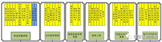 醫(yī)院智能化系統(tǒng)可拆分6大子系統(tǒng),包括信息基礎(chǔ)設(shè)施系統(tǒng)、公共安全系統(tǒng)、醫(yī)護(hù)專(zhuān)用系統(tǒng)、建筑設(shè)備管理系統(tǒng)、綜合集成管理系統(tǒng)、機(jī)房工程。
