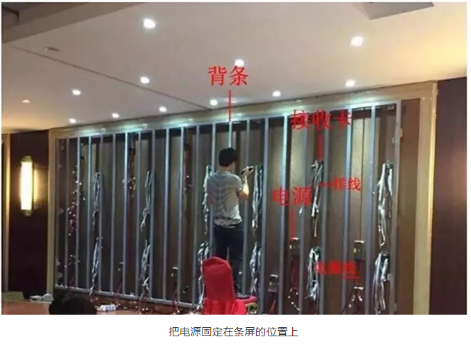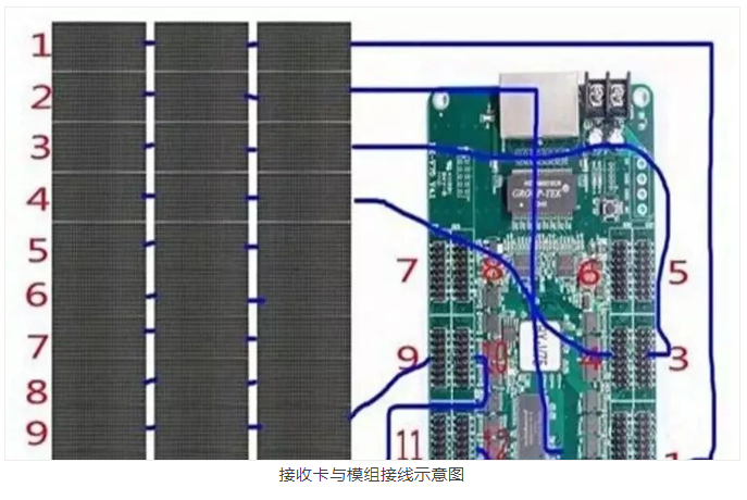 從配電室到LED顯示屏配電柜的電纜在安裝屏幕之前就必須布置好,電源接好后裝控制卡,控制卡這里用的是同步接收卡。整個電源和控制卡的布置,LED顯示屏出廠都是有《電源及系統(tǒng)布線圖》的,只要嚴(yán)格參照圖紙走線就不會出錯。一般工程師自己根據(jù)電源和卡的數(shù)量也可以估算出走線方式。