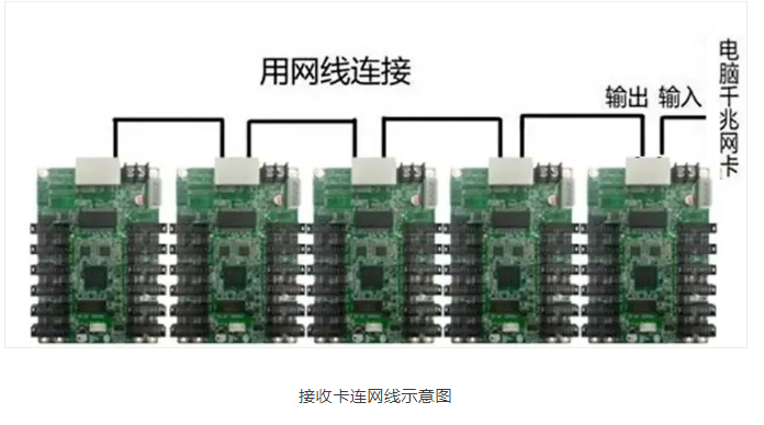 我們這里每張卡帶三列模組,共36塊板,這樣每三列裝一塊卡,從就近的電源上取5V給卡供上電,注意正負(fù)極,然后用網(wǎng)線把5張卡連起來,靠電源接頭的網(wǎng)口是輸入口,右邊是第1塊卡,也是頭卡,輸入接的是電腦的千兆網(wǎng)卡,然后輸出網(wǎng)口接的是第2塊卡的輸入口,第2塊卡的輸出口接的是第3塊卡的輸入口,這樣一直到最后一張卡,第5張卡,輸入接第4張卡的輸出。輸出口為空。