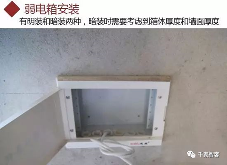 家裝弱電箱的一般大小為320X260mm,但隨著弱電產品和用途的增減,建議業主根據自家需求選用合適大小的弱電箱。弱電箱一般有明裝和暗裝兩種方法,明裝就是采用掛在墻壁或者放在角落里,暗裝則是將箱嵌入到墻體里,一般安裝在離地30cm左右,安裝需要考慮墻體厚度是否足夠承載箱體。