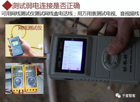 弱電驗收最重要的就是檢驗弱電連接是否正確,無斷路也無短路。網線和電話線測試的時候,需要用到網絡測試儀,根據儀器操作說明判斷線路是否連接正確;而有線電視線、音視頻線、音響線的測試需要用萬用表測試通斷;其他的弱電線路,則建議采用相應的專業儀表測試。