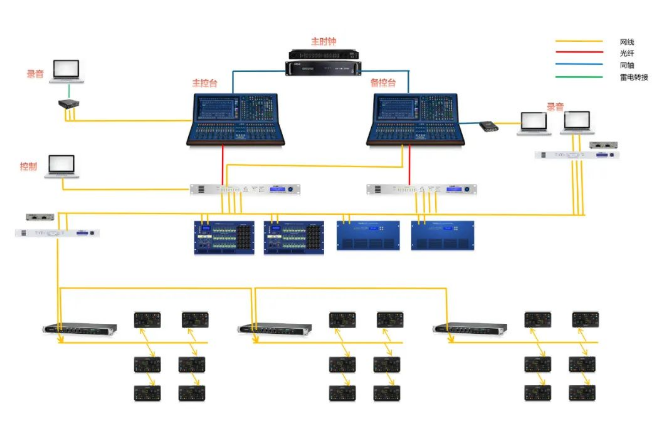 場景由兩張HD96-24調音臺登錄同一個賬號進行云端同步,兩張控臺分別通過光纖連接至舞臺下方的兩張KLARK TEKNIK DN9680的OPTICAL口。備份調音臺通過光纖連接以外,另外通過網線連接上主DN9680的COPPER口,在兩組信號獨立備份使用的同時,還可以通過電腦對DN9680進行連接方式的切換,備份調音臺可以快速地接管整個主控系統,這樣能起到雙重保險的作用。
