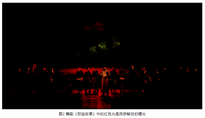 在舞劇《那些故事》中,同樣是用紅色光代表希望和光明。在黑暗籠罩著的舊中國,《共產黨宣言》給中國人民指明了方向。當滿懷熱血的陳望道譯完《共產黨宣言》時,天幕上出現了“共產黨宣言”五個金光閃閃的大字,這時紅色光像初升的太陽從“共產黨宣言”上方噴薄而出,舞臺上壓抑的藍色基調光漸漸地變成了暖暖的紅色,紅色光由“共產黨宣言”慢慢擴散、充滿整個舞臺,象征著火種傳遍祖國大地。一群學生、工人在紅光照耀下起舞,人們看到了民族解放的曙光。見圖2。
