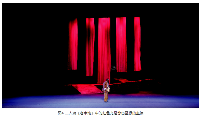 二人臺《老牛灣》是一部非物質文化遺產的戲曲劇目,劇中燈光用藍色光和紅色光表現了由淚水變成血淚的悲傷過程,更加突出了主人公悲痛欲絕的心情。這段戲講述留守兒童由于思念常年外出打工的媽媽,深夜冒雨出走去尋找媽媽。自愿義務承擔照顧村里留守兒童的果香得知后,和其他村民一起冒雨外出尋找孩子,由于天黑路滑,不幸摔下懸崖,摔成重傷,在村支書石強背著她回來的路上,果香死在了他的背上。這里需要交代一下劇情,果香與石強年輕時曾是一對戀人,但因果香父母包辦婚姻,一對戀人被拆散。兩人的誤解和隔閡益深。后來果香婚姻發生變故,她又孤身一人回到了村里,多年來埋藏在心底的愛的花火花重新燃起,只是兩個人都沒有表露出來。老書記臨終前撮合果香和石強,兩人和好,半輩子的愛終于有了結果。可就在兩人對未來充滿美好憧憬時,果香卻永遠離開了他。突然降臨的悲傷擊倒了石強,他淚如泉涌。這時舞臺上有五條白紗慢慢地垂下來,這白紗是淚水,是石強的淚,是村民的淚,也是留守兒童和觀眾的淚水。藍色的燈光從白紗的頂端慢慢鋪滿整條紗,是淚水在流動,隨著音樂和悲傷的劇情進入高潮,藍色的紗從頂端慢慢地變成了紅色,淚水變成了血淚。石強的淚水哭干了,在悲痛到極點,欲哭無淚時流下了血淚。血淚的燈光語匯把戲劇情感又推上了一個高潮,筆者稱之為“悲傷之光”。有人不解:紅色不是代表喜慶嗎?怎么在悲傷的時候也用紅色光?其實,燈光沒有固定的模式,舞臺燈光的色彩語匯也不是固定不變的,這種語匯需要劇情來鋪墊。不同情境、不同情感,同一光色有不同的燈光語境。