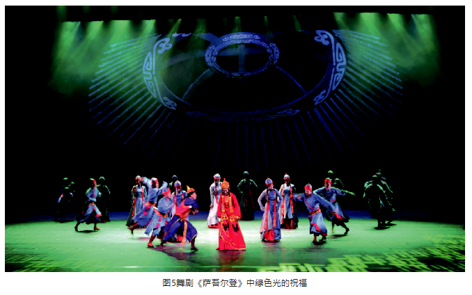 除了紅色光以外,綠色光有時也用來表現喜慶的場面、表達美好的祝愿。在舞劇《薩吾爾登》中,草原婚禮一場就用了綠色光而沒有用紅色光。喜慶場面一般是用紅色光的,但為什么用綠色光呢?在這里,綠色光恰恰是對一對新人的祝福,草原人民最大的幸福就是希望綠油油的草原一望無際,綠草肥美,牛羊成群。這綠色是送給新人的禮物,是無邊無際的大草原對他們的祝福。婚禮氈房的頂子給了藍色光,周圍用綠色光襯托,預示著草原的天空永遠是藍的,像寶石那樣透徹,白云悠悠,綠草鋪地,一對新人生活在綠色海洋托起的藍天下,幸福美滿。見圖5。