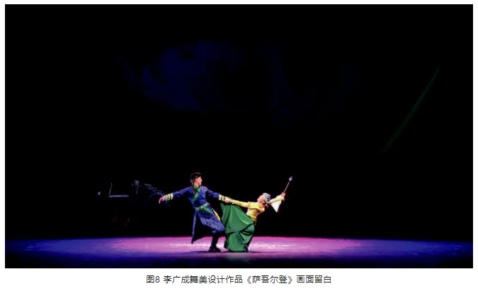 首先,舞美設計要“留白”。這和中國國畫中的“留白”有些相似,只是空間維度不同。畫國畫時畫面要“留氣”,也就是“留白”,畫面不能充得太滿,要留出沒有潤筆的空間。舞臺美術也是一樣,同樣不能把畫面充滿。所以,舞美設計對畫面的審美素養及觀念至關重要。舞美設計在一部戲的二度創作中是走在燈光設計前面的,導演對舞美設計的要求比對燈光設計的要求更多,舞美設計的意圖常常體現了導演的要求。因此,舞美設計掌控著畫面的審美基礎,舞臺畫面的呈現與審美首先在于舞美設計。但是,舞美設計師也有只注重自我表現的情況,在舞臺空間設計了大量的景片,包括硬景和軟景,把吊桿掛得滿滿的,在吊裝空間上沒有給燈光留下充分的發揮余地,在視覺上把舞臺畫面搞得非常擁堵。少了“留白”,也就缺少了層次。中央戲劇學院劉杏林教授的作品《牡丹亭》,舞美像一張水墨畫,簡單的幾筆,透著靈性。還有北京舞蹈學院高度教授導演的《薩吾爾登》,對舞美、視頻的要求也是點到為止,舞臺畫面干凈、完整。見圖7、圖8。