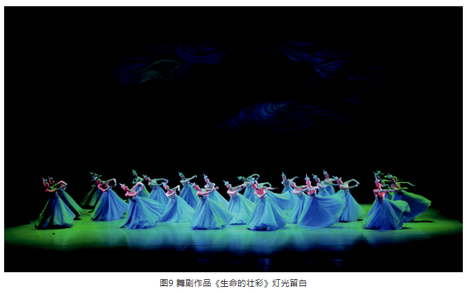 另外,在光位的選擇上,盡量選擇側光位,側光位的光束要較逆光弱一些。光區的邊界在沒有特殊要求的情況下,盡量以柔光斑虛化處理,避免硬光斑的清晰邊界。燈光色調要與舞美統一,表演空間光比關系層次分明、把握準確。特別是景光,在舞美沒有給畫面“留白”的情況下,有的景片可以作無光處理,用不給光來實現舞臺畫面“留白”,這樣才能保持畫面的完整性。見圖9、圖10。