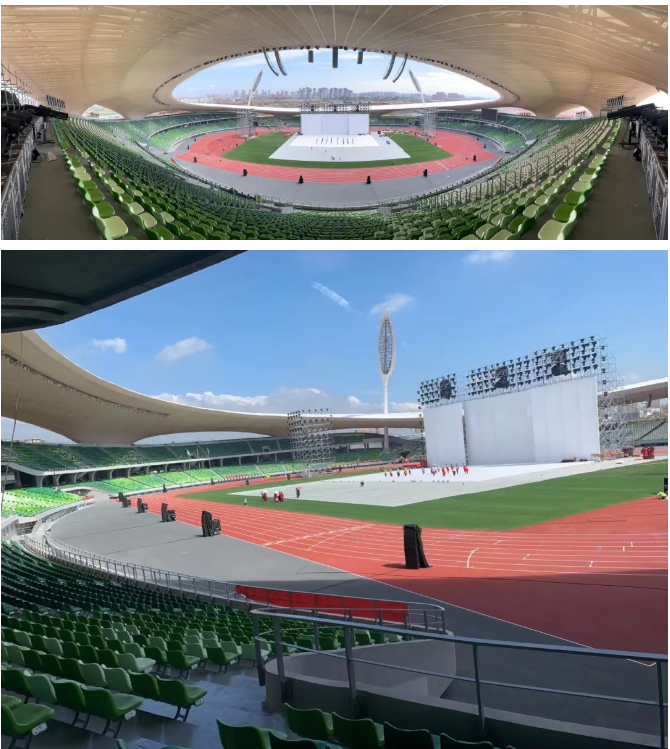 為確?,F場最佳的視聽體驗效果,本屆體育大會擴聲系統采用源自德國的EV32只X1I-212/90-FGB垂直線性陣列搭配12只X2-212/120心形指向性超低作為主擴組合,16只EVF-2151D垂直線性陣列搭配4只X12-128次低頻音箱及8只EVF-1181S超低音箱作為兩側補聲組合,主席臺和演員返聽由8只多功能鏡像全頻揚聲器MFX-15MC擔任,整個擴聲系統由32臺PX5:4功放進行驅動。