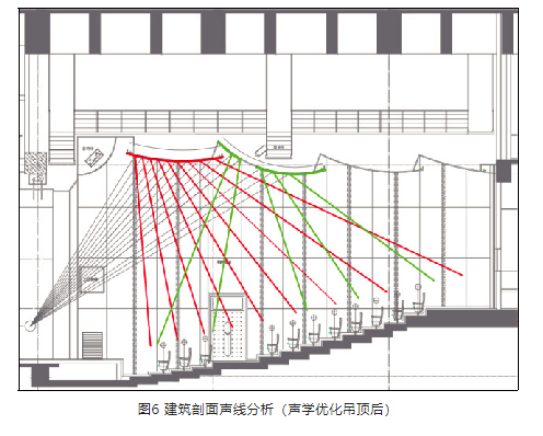建筑剖面聲線分析(聲學優化吊頂前)見圖5,建筑剖面聲線分析(聲學優化吊頂后)見圖6。