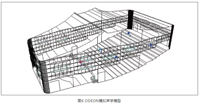 為驗證聲學設計的合理性與科學性,對音樂廳進行三維建模與音質模擬(圖6),通過仿真計算,預測廳內各項音質指標是否滿足設計要求。此外,為進一步將音質指標“可聽化”,在設計過程中,將仿真計算得到的脈沖響應與消聲室內錄制得到的音頻信號進行卷積,預制音樂廳建成后的音頻信號,然后借助多聲道還聲系統建立“虛擬聲場”,讓聽者在音樂廳建成之前切身感受其音質效果。本項目利用的是8.1通道還聲系統,可基本正確反映直達聲與早期反射聲的方位。