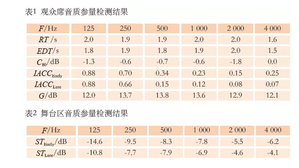 音樂廳竣工后,設計團隊對音樂廳進行聲學檢測[3](空場狀態)。廳內主要音質指標測量結果如表1所示。
