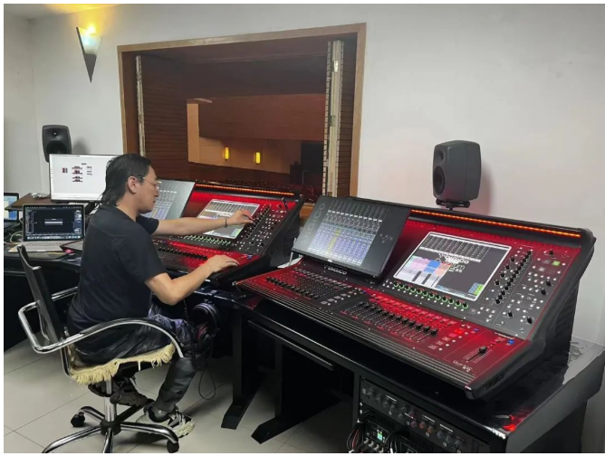 主擴使用L-Acoustics A15i(A15i Foucs、A15i Wide)。A15i擁有Panflex技術,可在現場很直觀地調節(jié)好音箱的聲輻射方向,保證觀眾席各個區(qū)域內都可獲得較為均勻的直達聲,精準的角度投射有利于實現聲場的全覆蓋;低頻音箱使用KS21i,擴展低頻下限。 主擴系統明裝線陣列吊掛置舞臺上方,明裝吊掛使聲音不受阻擋,能大幅度減少對聲能的損失并提高清晰度。且A15i外觀干凈整潔符合場地的審美需求,是聽覺效果和視覺效果的最佳解決方案。 補聲和返送系統選擇X12多功能同軸系統揚聲器。擁有90°x60°橢形指向性,可根據現場聽音需求進行調整,確保獲得最真實的聽感。 臺唇比較靠近觀眾區(qū)域,選擇小巧的5XT揚聲器補充前排觀眾的聲音能量,有效避免對觀眾視覺體驗造成影響。另外,臺唇高度的設置也十分合理,恰好高于桌子避免被遮擋,使前區(qū)的聽眾獲得更多直達聲。 調音臺使用兩張DiGiCo Quantum 225互為鏡像備份,兩張同型號、同版本的調音臺之間進行實時的數據同步,一個人可同時操作兩個調音臺,方便快捷。主備設備還能隨時切換,穩(wěn)定性大幅提高,全面保障演出過程中音頻信號穩(wěn)定傳輸。 升級改造后的效果受到大家的一致好評,沉浸式的聽音環(huán)境有效提高觀眾的感官體驗,震撼的效果深深感染和陶醉著在場的每一位觀眾,引發(fā)強烈的情感共鳴。
