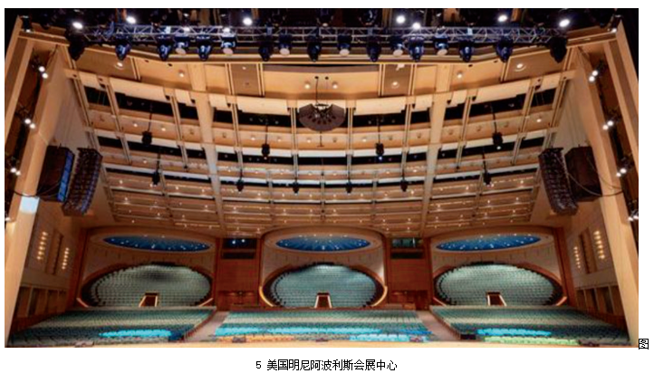 此外,還有一些劇場由于應用場景的不同,揚聲器系統既要減少舞臺垂直方向上對觀眾的視覺影響,還要滿足較寬觀眾席對水平覆蓋的需求。例如美國明尼阿波利斯會展中心使用ARCS恒定曲率線陣列揚聲器,這種揚聲器陣列在垂直方向上的輻射角度不可調整,但水平角度上中置揚聲器幾乎可以覆蓋到整個觀眾席,甚至可以比左右聲道揚聲器承擔更大的功率,這對于以語言類為主的會議等應用場景來說是十分方便且有效的。